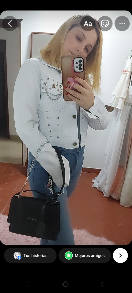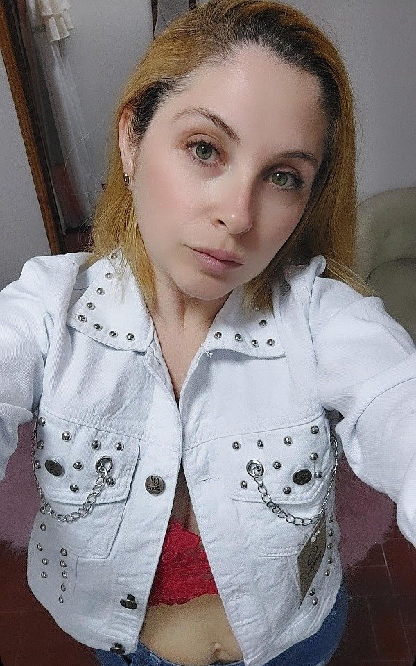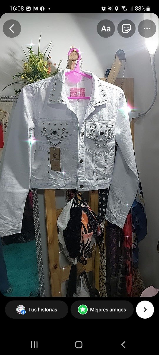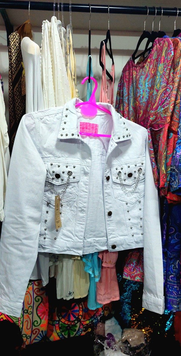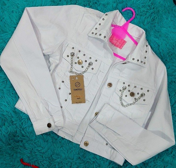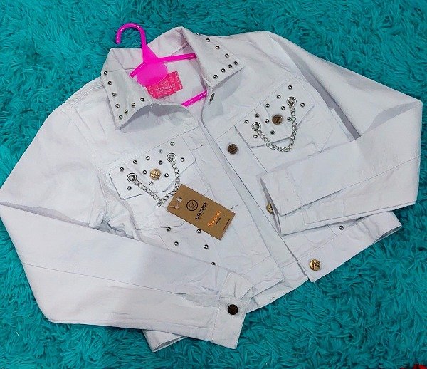 Campera de jeans con detalles, en tachas y cadenas corta .talles S,m, L y Xl Color blanco.