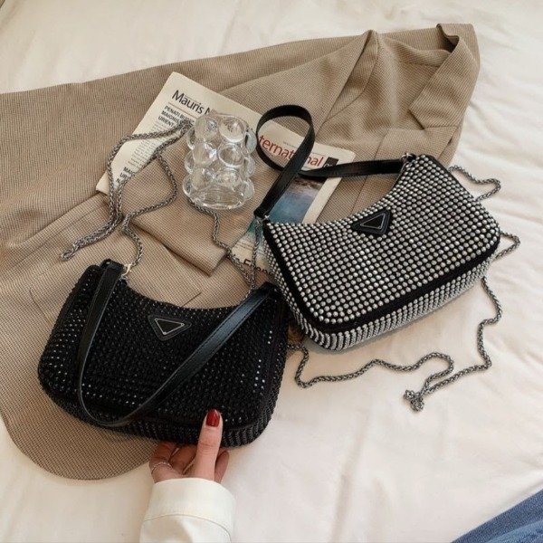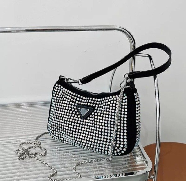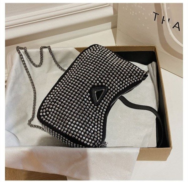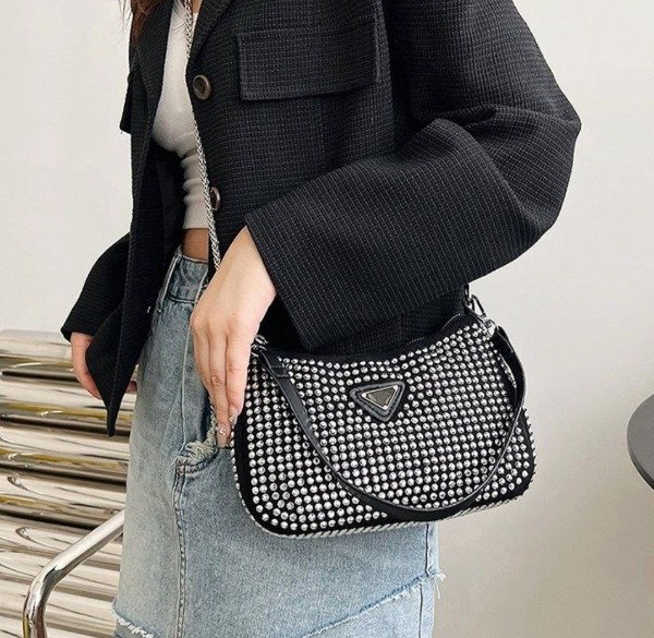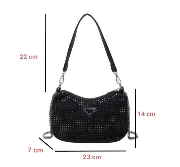 Toda forrada en tachitas Strass ,importada con 2 correas una corta y una larga en cadena. Medidas en las fotos