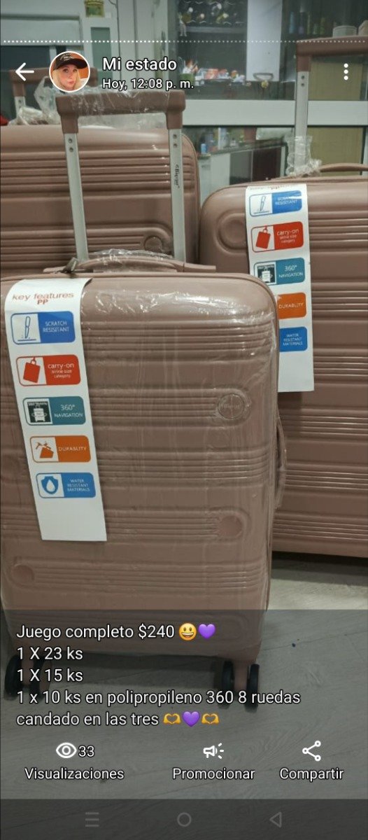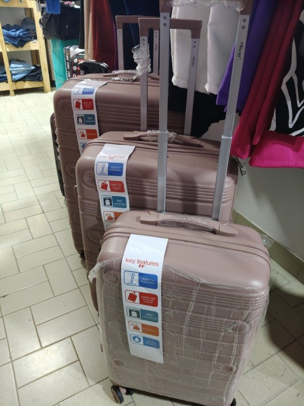 Juego de maletas polipropileno,en sus tres medidas ,todas con 8 ruedas giro 360,y candado de regalo . compartimentos con cierres y bolsillos .