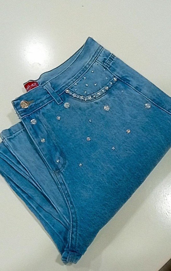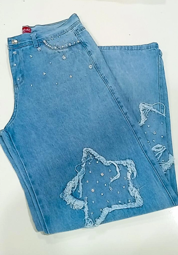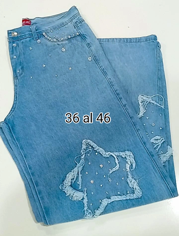 Jeans widleg rijido,con apliques de pedrería. Strass del talle 36 al 46.color celeste.