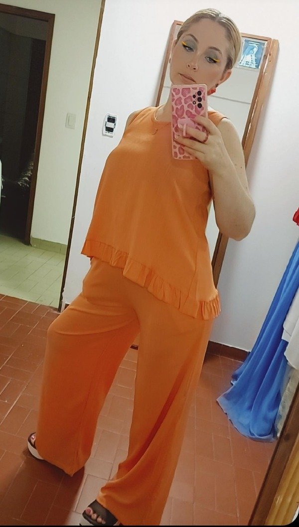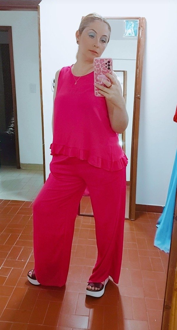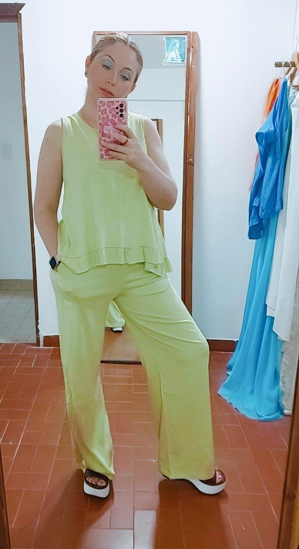 Conjuntos premium de Lino elastizado pantalón con bolsillos y blusa musculosa con detalle en la espalda abierta y volados talles del 1 al 5 varios colores disponibles