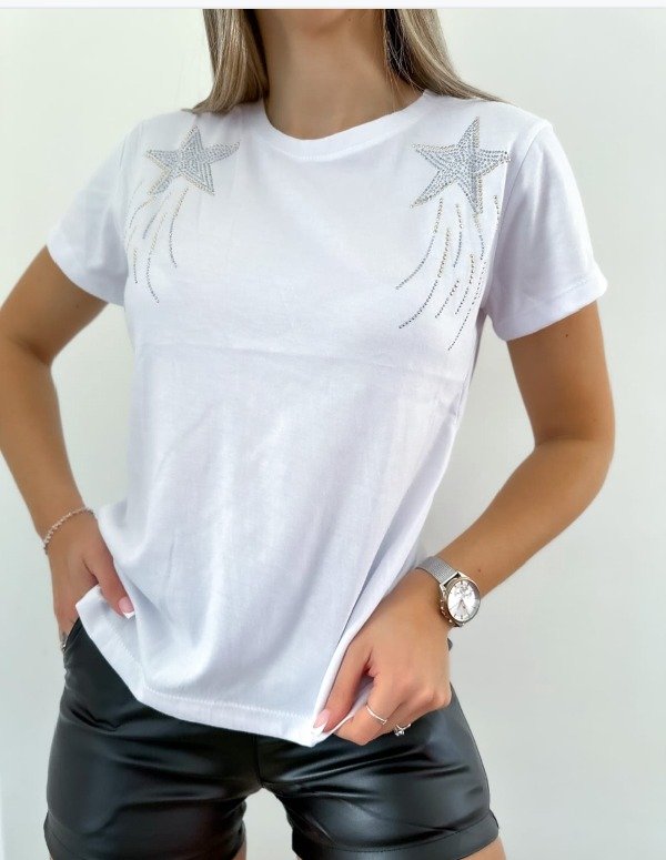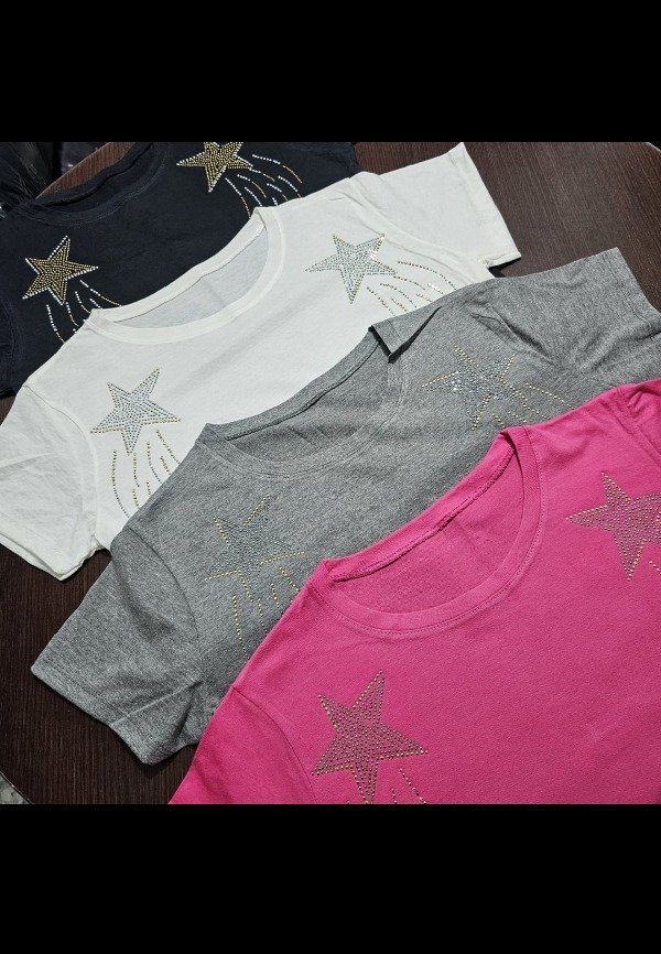 Remera básica con apliques talle único cuello redondo talle único abarca un 3 colores medidas 52 cm de ancho largo delantero 60 cm y 65 cm espalda .Colores en las fotos.
