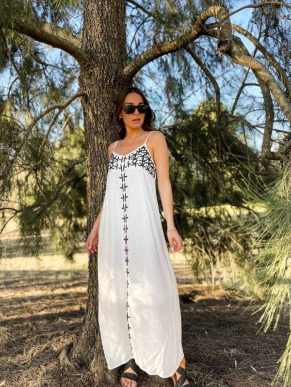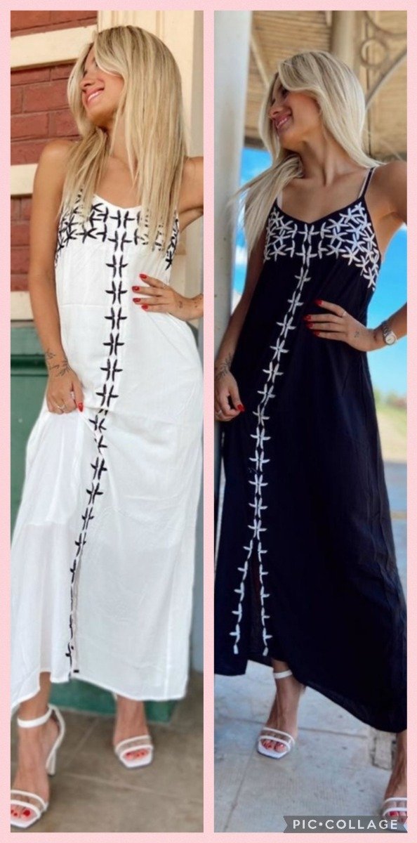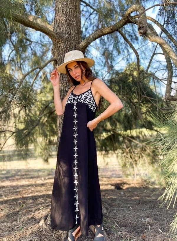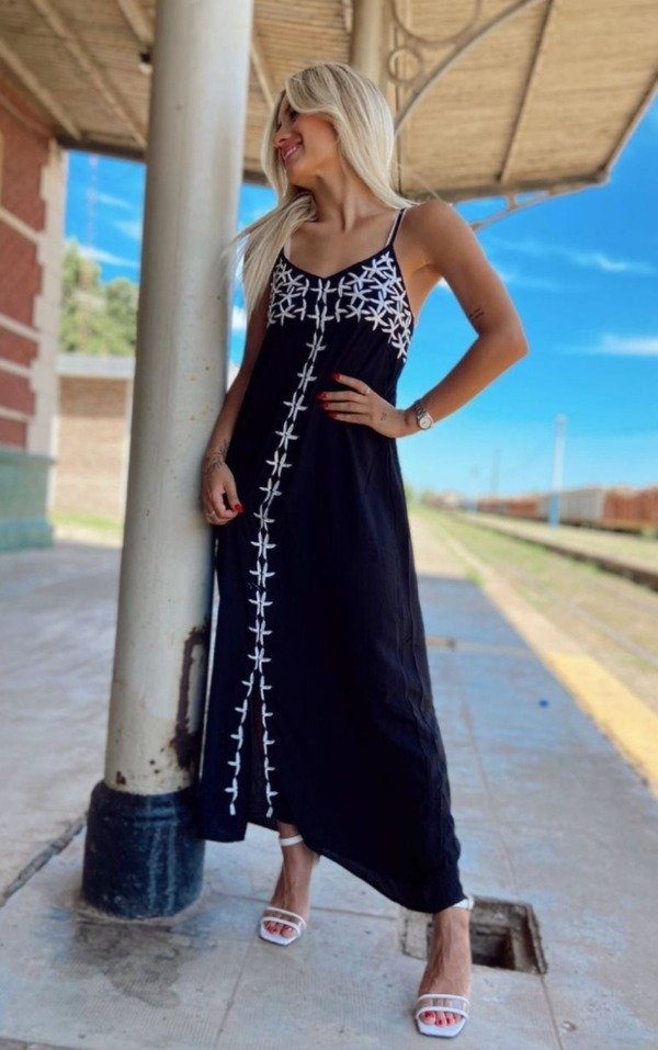 Vestido en fibrana con detalle en el frente de bordado ,breteles regulables y completamente forrados . Talles sm y lxl