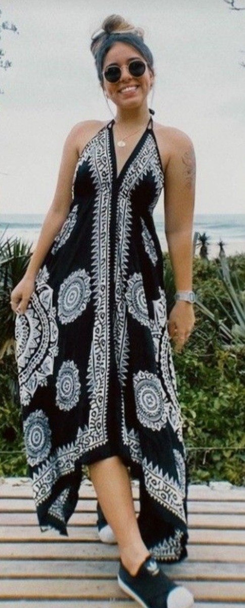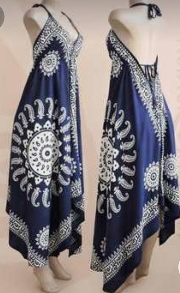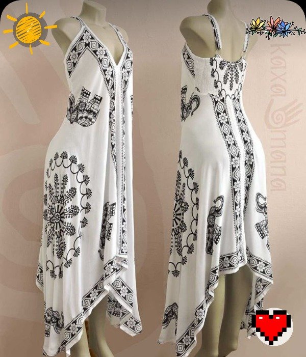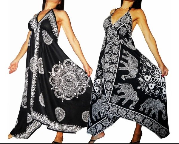 Vestido Importado talla única muy adaptable ,por medio de cordones y por su estilo de corte colores azul marino ,negro ,blanco ,dibujos de Elefante y Mándala .ULTIMO NEGRO